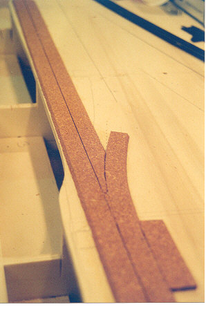 Als Gleisunterlage verwendete ich für die Zubringergleise die allseits bekannte Korkbettung von Heki (4 mm dick) und im Bahnhofbereich jeweils 2 Lagen Korkplatten aus dem Baumarkt (je 2 mm dick). 4mm Korkplatten waren leider gerade nicht verfügbar. Beides klebte ich mit einem 0815 Korkkleber aus dem Baumarkt auf die Segmente.