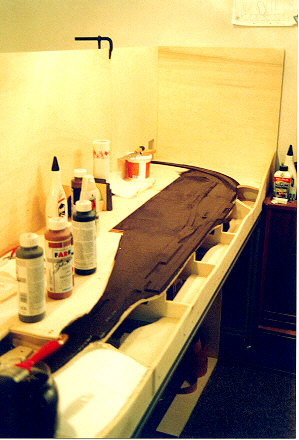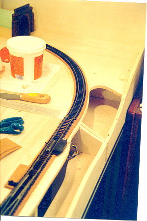 Im sichtbaren Bereich verwende ich die 14°26' Weichen, im Schattenbahnhof tun es auch die 22°30' Weichen. Vor dem Einbau wurden die Gleisprofile der Weichen mit Rostfarbe eingelassen (Humbrol Nr. 113). Ich folgte hier einem Vorschlag aus [5], wobei ich im nachhinein immer noch ganz "high" von den Dämpfen bin. Außerdem denke ich, dass diese Einfärbemethode nur für kleinere Anlagen in endlicher Zeit machbar ist.