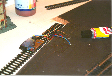 Vor dem Aufkleben der Gleise lötete ich an diese Masse- und Mittelleiterkabel. Die Zuleitungen legte ich recht üppig aus, zumindest denke ich das, um später einmal keinerlei Probleme bei der Stromzuführung zu bekommen.