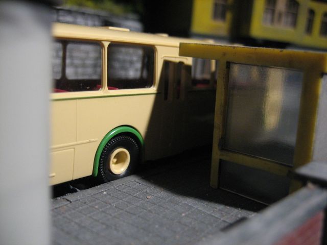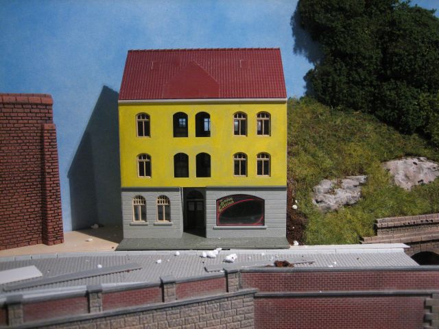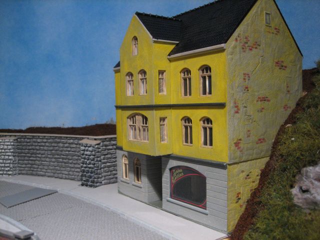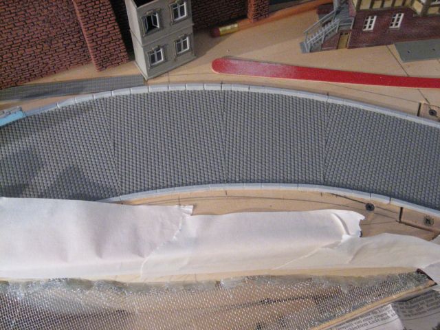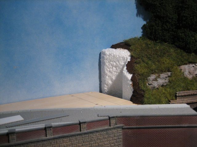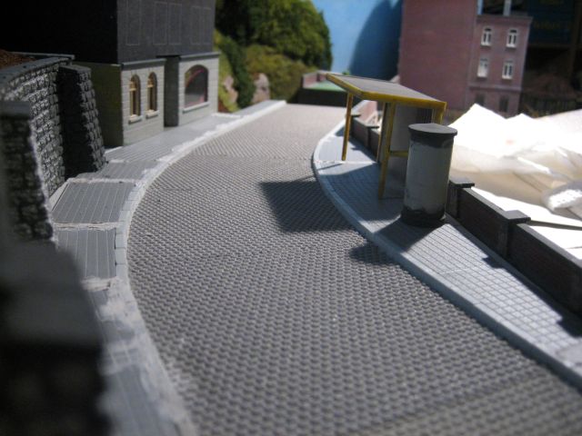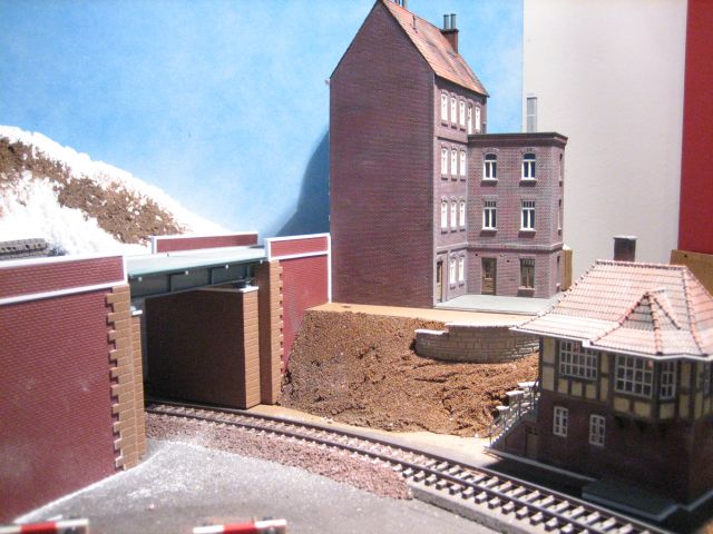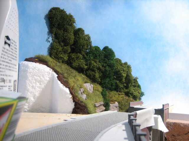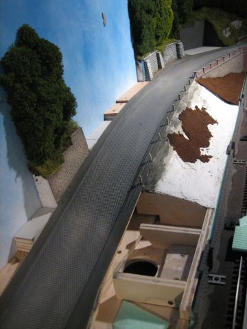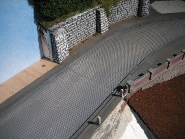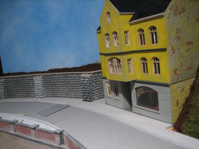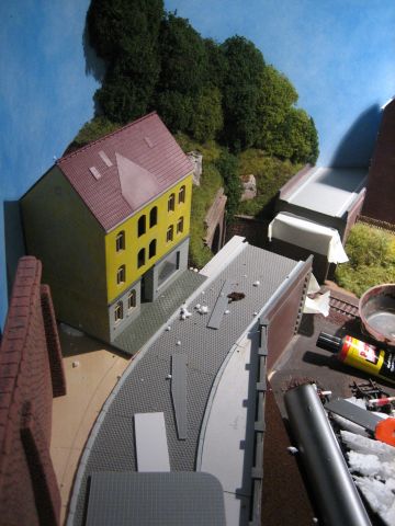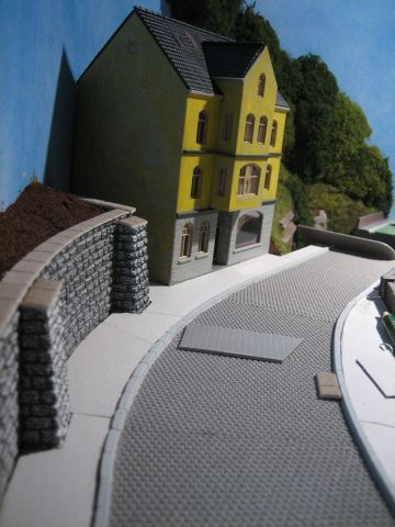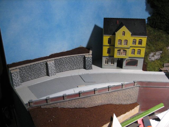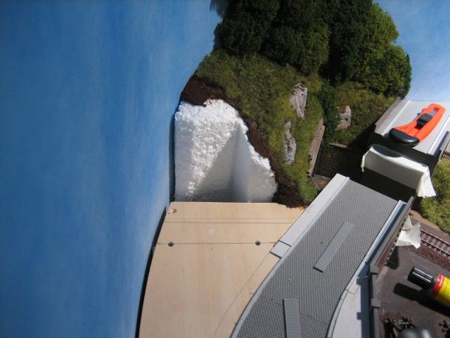 Nachdem der Rest des Segmentes schon ganz ansehnlich ist, trübt der weiße Styroporklotz natürlich das Erlebnis. Daher ist er jetzt an der Reihe und wird so gut es geht fertig gestellt. Ganz geht noch nicht, da ich mich noch nicht für ein entsprechendes Gebäude links der Brücke am Hang entschieden habe.