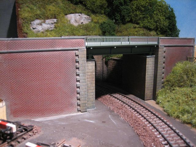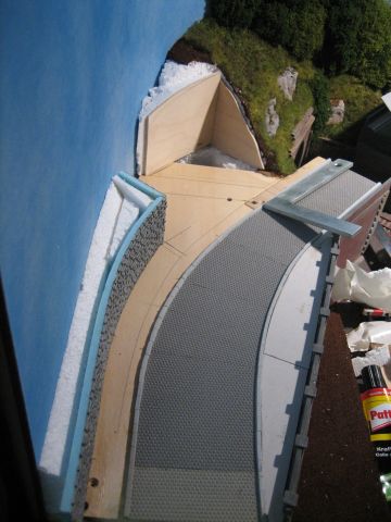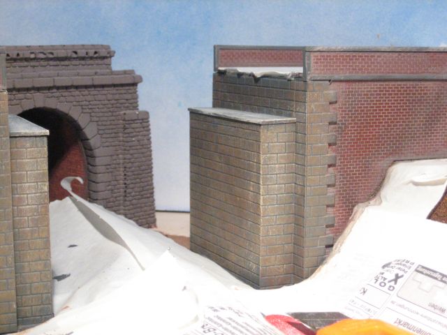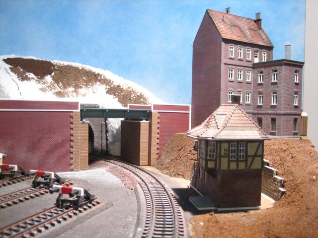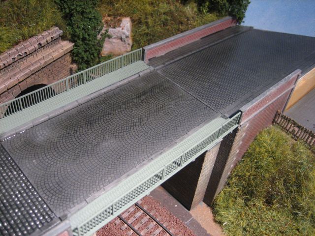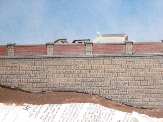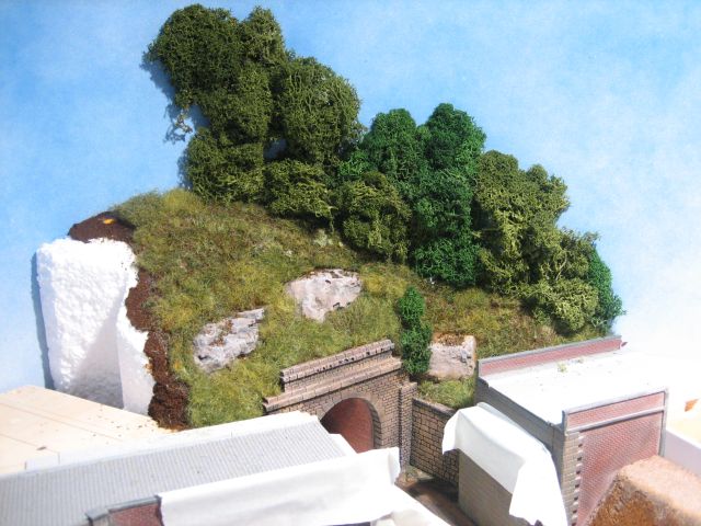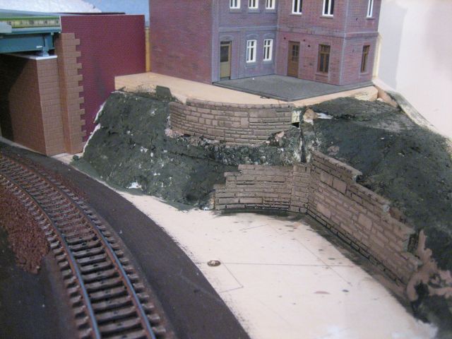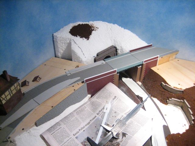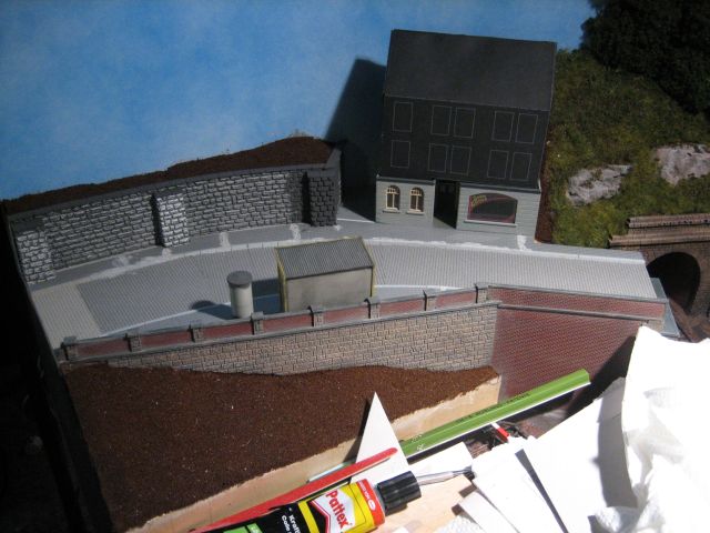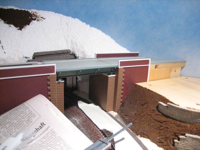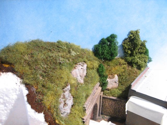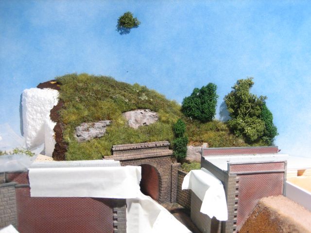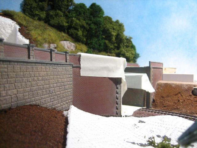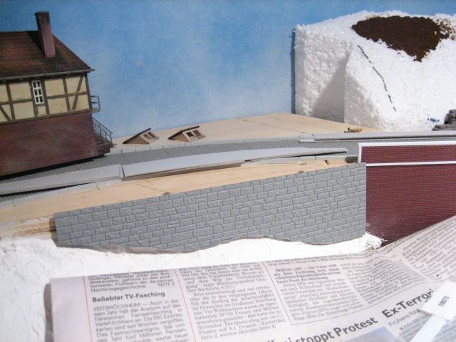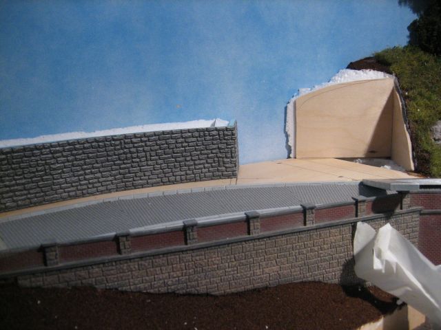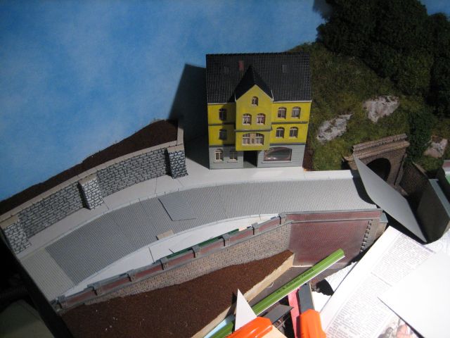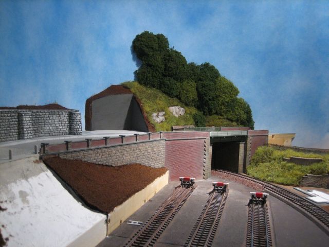 Da es zwischen Tunnelportal und Brücke ziemlich eng und steil zugeht, musste ich erst einmal zwei Stützmauern einbauen und das steile Gelände mit ein paar selbst gegossenen Felsen plausibel erscheinen lassen. Ich hoffe das passt so...
