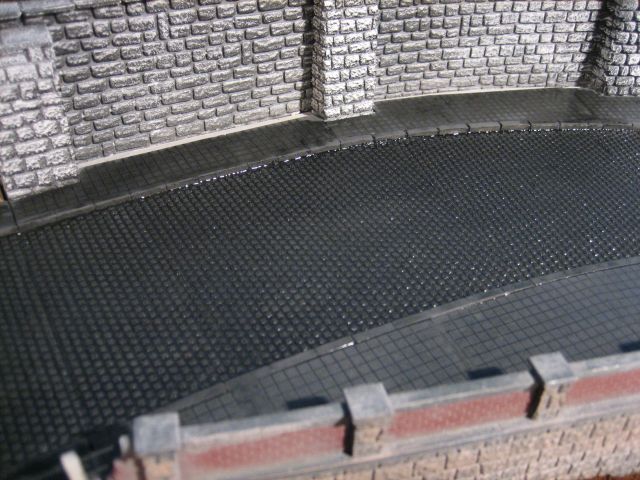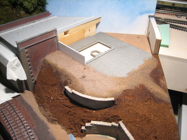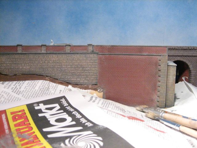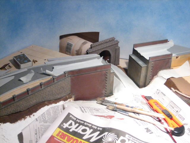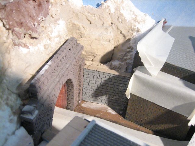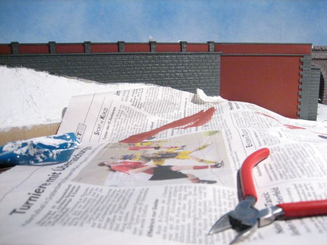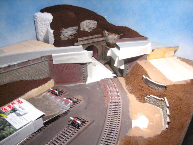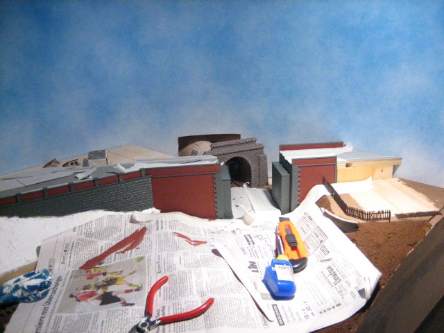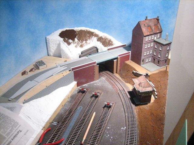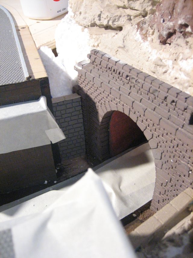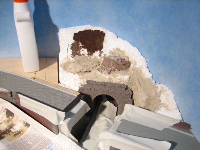 Nun folgte neben der farblichen Standardbehandlung des Portals und der Stützmauern, der Überzug des Berges (oder doch nur des Hügels) mit der bekannten Gelände-Spachtelmasse (siehe Hexenküche).