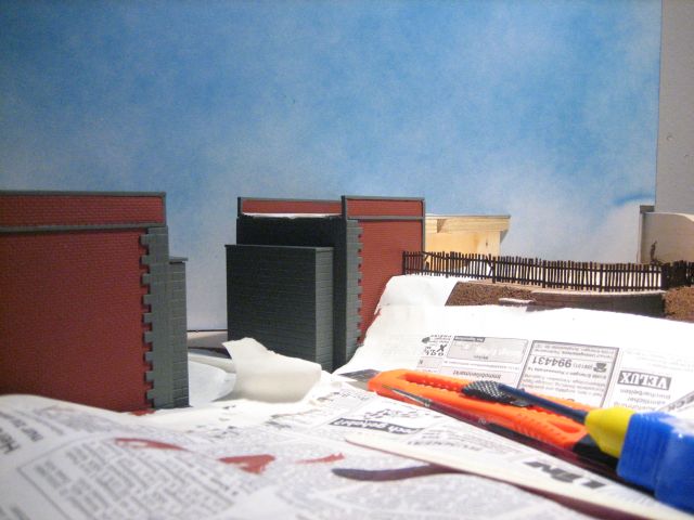 Eine Woche später ist nun die Begrünung am Zuge. Dabei gehe ich so wie bei der Begrünung des Fabrik-Segmentes vor. Erst werden unregelmäßig, verschiedene Grasteile aufgeklebt. Danach wird mit dem Waldboden von Busch noch die eine oder andere kahle Stelle nachbehandelt. Auch wenn noch nicht alles durchgetrocknet ist, kann man den Moos schon an die Kulisse kleben. Ich verwende dazu einfach Heißkleber.