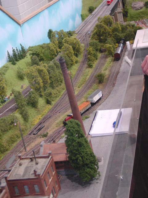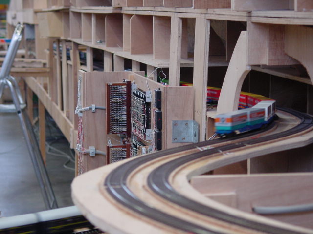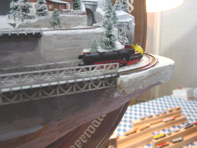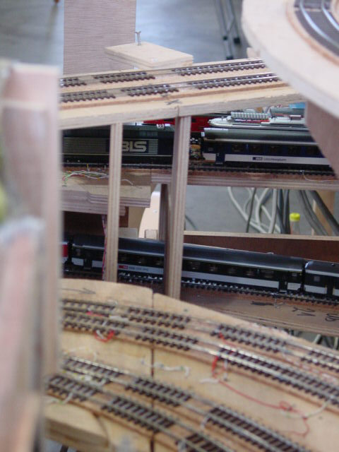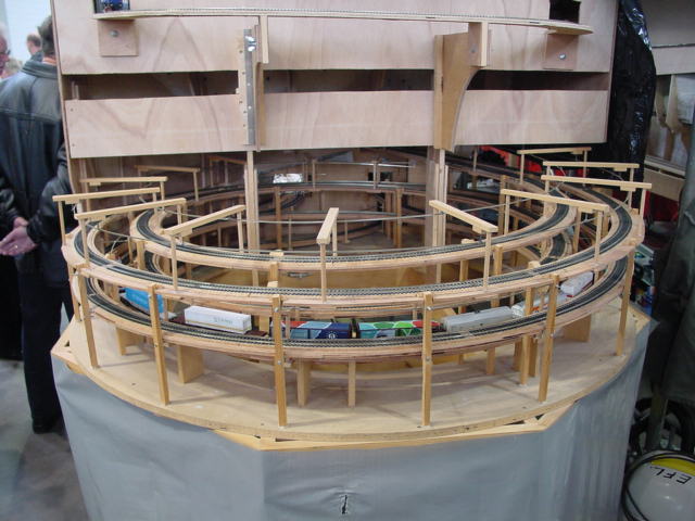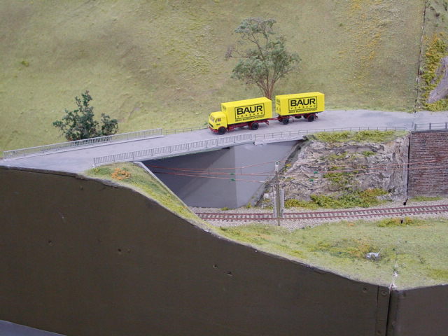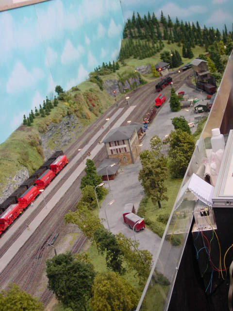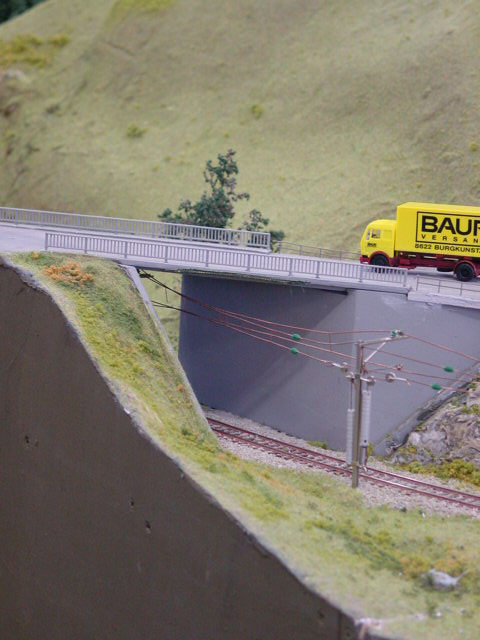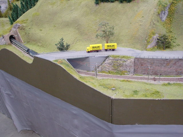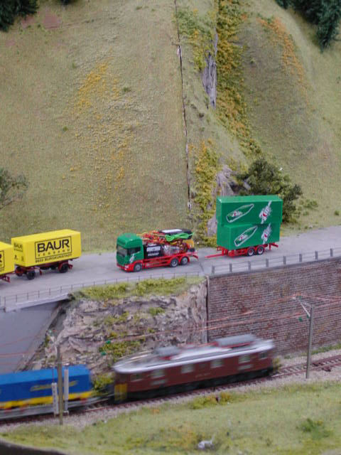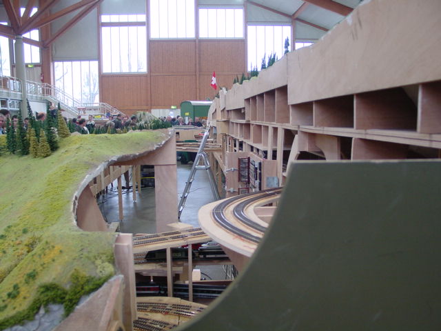 Großbahn nach Schweizer Vorbild. Es ist eigentlich immer schön auch einmal einen Blick hinter die Kulissen werfen zu können. Dabei stellt man dann beruhigt fest, dass andere Ihren Untergrund auch ganz gewöhnlich bauen. Hier war die Vorführung eines ferngesteuerten HO LKWs hochinteressant. | |||||||||||||||