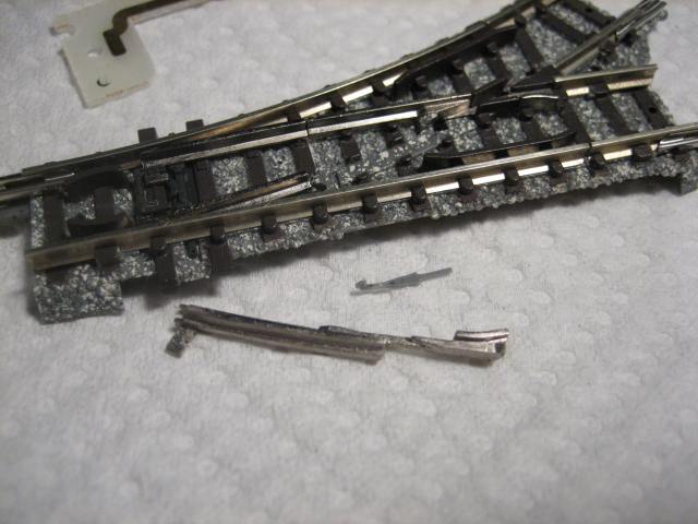 Daher habe ich die Weiche verlegt, um die Herzstücke herauszubekommen. Dann konnte ich sie bequem anfeilen. Man sollte allerdings vorsichtig vorgehen, da mir ein Mittelstück gebrochen ist (allerdings ohne weitere Probleme).