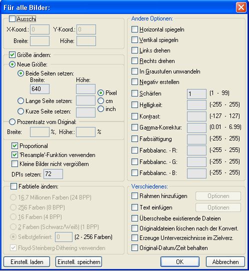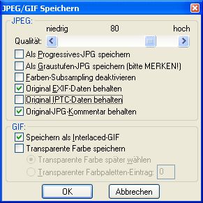 Noch über den Button Optionen die entsprechenden Einstellungen für das Speichern von jpeg Dateien setzen. Eventuell kann man die Qualität noch auf etwa 70 erniedrigen.