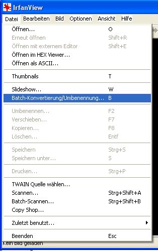 Im Programm IrfanView wird über Datei -> Batch-Konvertierung/Umbenennung... das Batch Modul aufgerufen.