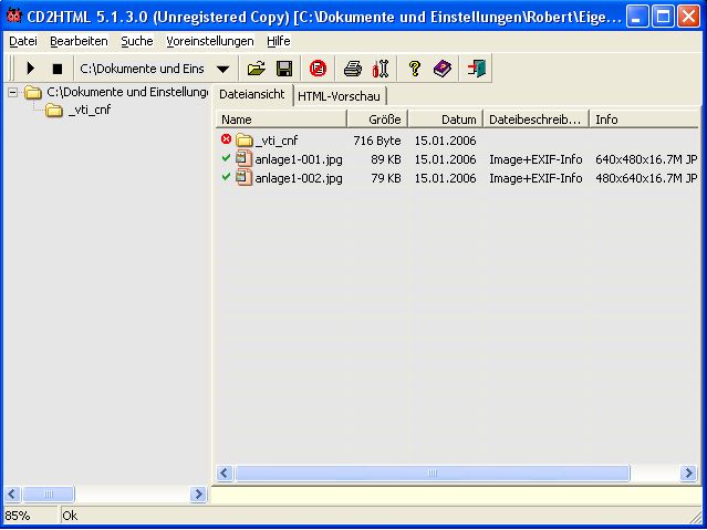 In cd2html wird das Verzeichnis mit den konvertierten Bildern geöffnet und nach Auswahl der richtigen Optionen die Erstellung der html Übersicht gestartet.