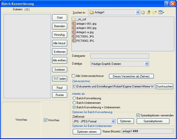 Nun werden alle Bilder ausgewählt und er Liste hinzugefügt. Noch den Start Button drücken und die Konvertierung startet. Nach kurzer Zeit sind alle Bilder konvertiert und umbenannt.